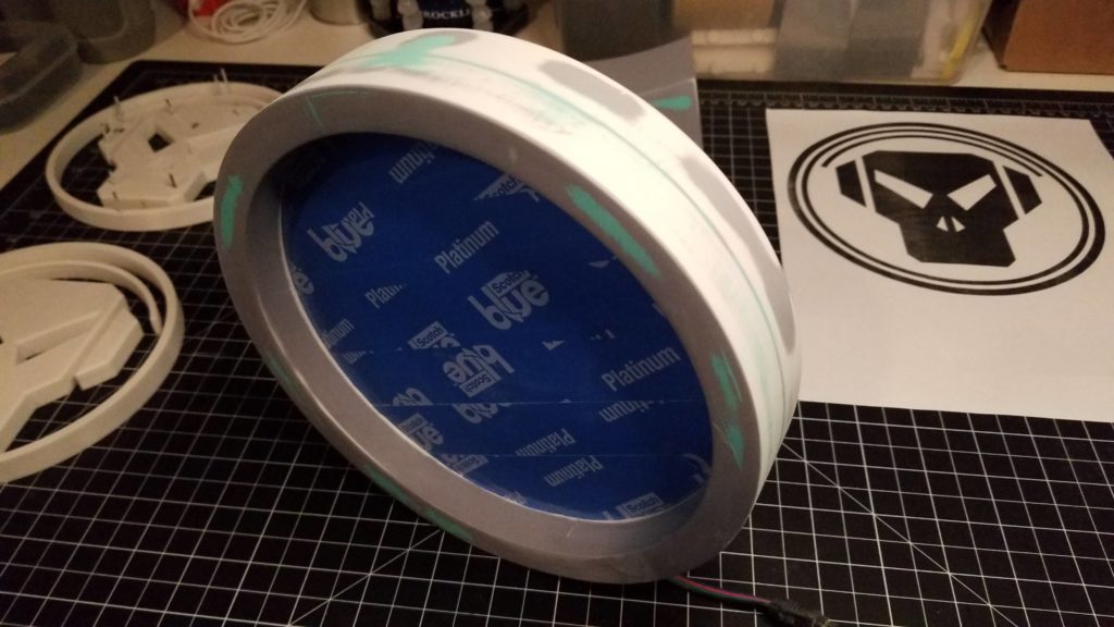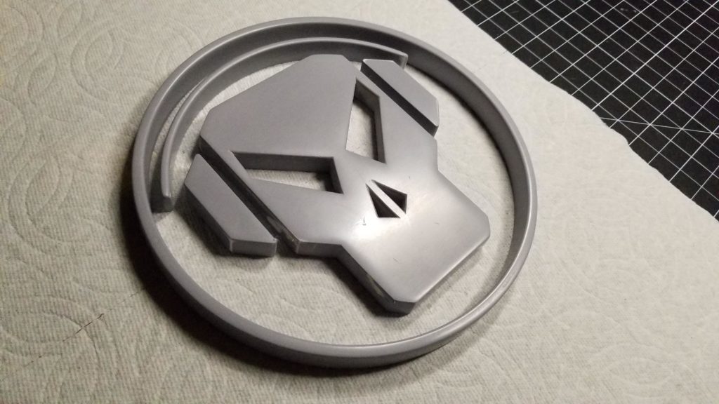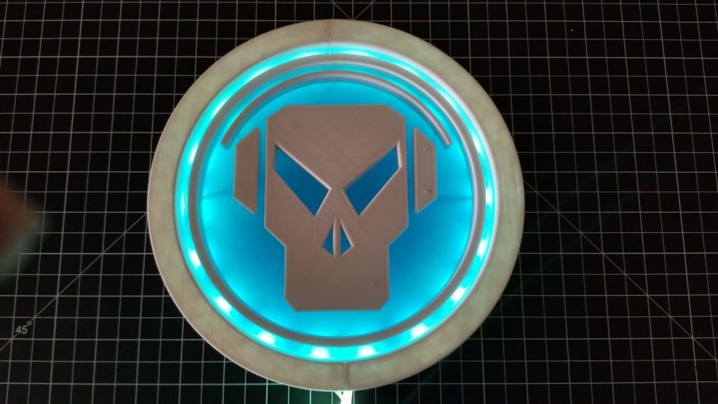 The main logo came out great, but the outside ring had some problems. 1) It’s just a little too big for my printer so I had to print it out in two halves. 2) The cutout for the acrylic/lights needed supports to print and when I tried clearing them out, it visibly chewed up the plastic. 😕